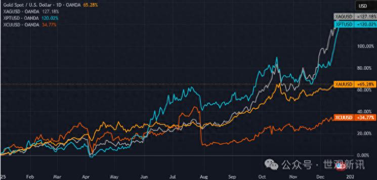 贵金属市场2025年表现靓丽,截至周五,黄金年涨幅超65%,白银以超过132%的年涨幅成为大宗商品的明星,铂金紧随其后年涨幅达120%,铜年涨幅达35%,随着下周圣诞假期和接下来的新年假期的临近,市场也开始关注2026年贵金属市场的前瞻。